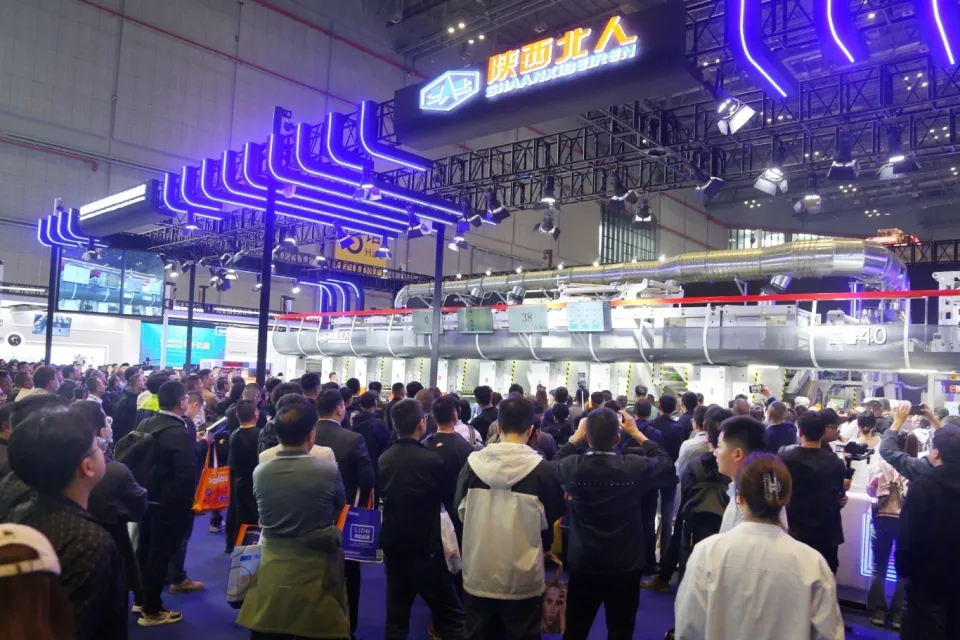 陜西北人至睿4.0智能高速凹版印刷機作為全場亮點,從快、精、準、全自動套印、穩(wěn)定升速、400米/分鐘高速高品質印刷、全自動接換料幾個方面,現(xiàn)場演示了陜西北人設備的卓越性能,充分彰顯了陜西北人印刷機智能、穩(wěn)定、高速、環(huán)保、低損耗等特質。現(xiàn)場多頻次開機演示,贏得了觀眾及其他展商的認可好評。